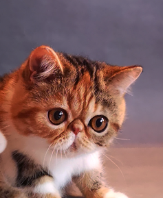 stunning large round eyes with a rich copper-golden eye color, round and short Exotic face ! His coat is a clean Snow White color accent with a Red Mackerel Tabby pattern. He is ultra sweet which will carry on to his kittens and will be an excellent cross to Blueberry Delite (Dam) and Candy Kisses Delite (Dam). He will be producing kittens for 2020 litters !